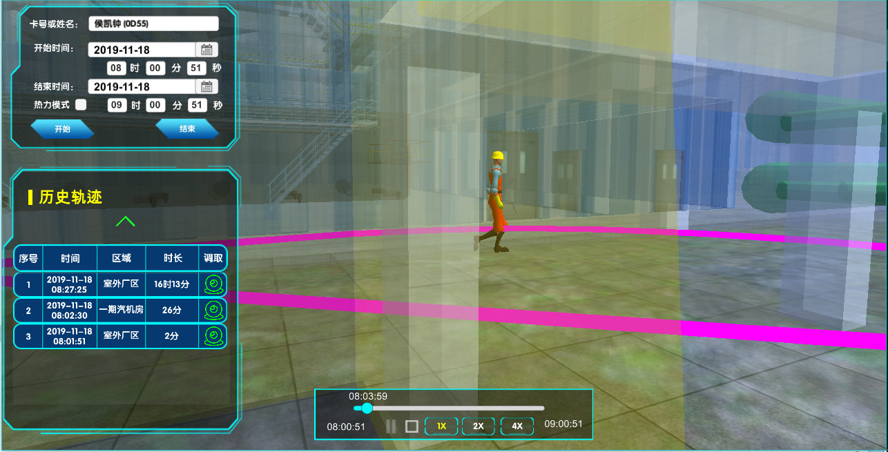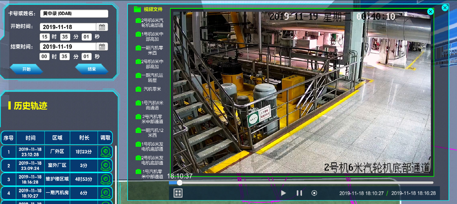 系統支持接入電廠視頻監控系統,在三維電子地圖上顯示視頻監控位置,任意切換調取視頻監控。可實現快速查找、單點回放、圖像識別等功能。同時可基于人員當前位置自動調取對應的視頻監控,對人員行走到其他位置自動切換到相應監控畫面。對于發生異常的情況,可基于人員歷史軌跡不同位置及不同時段調取相應位置相應時間段的歷史視頻監控,與歷史軌跡聯動播放,方便事故分析及責任劃定。