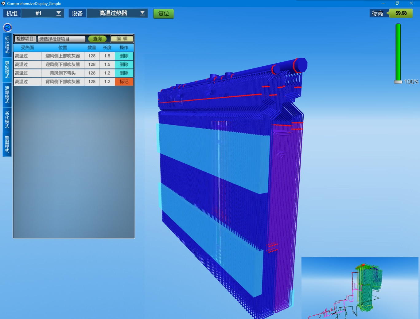 云酷科技針對鍋爐四管防磨防爆所設計的管理系統通過三維可視化平臺,利用日常運行與檢查過程中的各類數據,為運行、檢修人員的設備狀態監控、劣化趨勢評估、防護措施選取、檢修工作安排等工作提供便捷的輔助工具,實現變被動應對為主動干預。